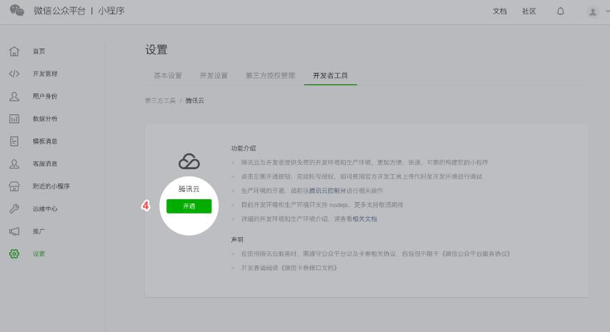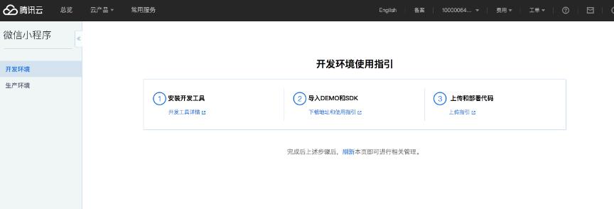使用小程序綁定的微信掃碼即可將小程序授權(quán)給騰訊云,開通之后會(huì)自動(dòng)進(jìn)去騰訊云微信小程序控制臺,顯示開發(fā)環(huán)境已開通,此時(shí)可以進(jìn)行后續(xù)操作。