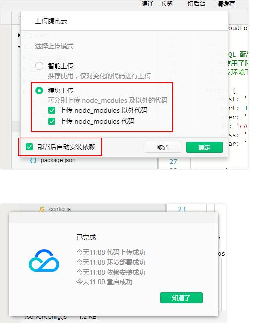 選擇【模塊上傳】并勾選全部選項(xiàng),然后勾選【部署后自動(dòng)安裝依賴】,點(diǎn)擊【確定】開始上傳代碼。