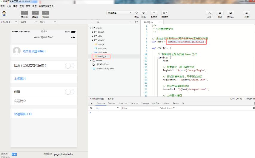 完整復(fù)制(包括 https://)開發(fā)環(huán)境 request 域名,然后在編輯器中打開 client/config.js 文件,將復(fù)制的域名填入 host 中并保存,保存之后編輯器會(huì)自動(dòng)編譯小程序,左邊的模擬器窗口即可實(shí)時(shí)顯示出客戶端的 Demo: